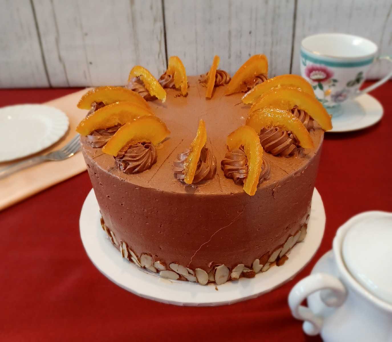 - almond cake, orange marmalade filling, chocolate frosting