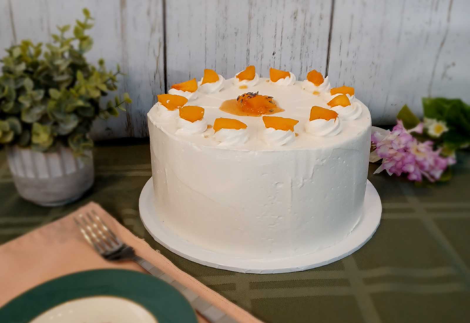 - vanilla cake, mango passion fruit filling, vanilla frosting